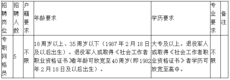 (四)大專及以上學歷,專業(yè)不限;退役軍人或有社會工作者職業(yè)資格證書的,學歷可放寬至高中;