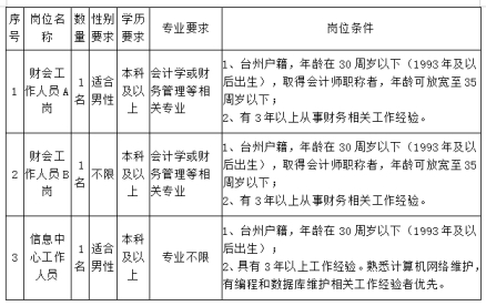 因工作需要,臺(tái)州市椒江區(qū)財(cái)政局現(xiàn)面向社會(huì)公開招聘編外工作人員3名,具體如下: