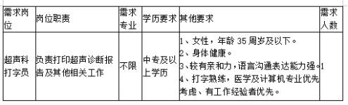 因醫(yī)院工作需要,臺(tái)州市中心醫(yī)院(臺(tái)州學(xué)院附屬醫(yī)院)決定面向社會(huì)公開(kāi)招聘超聲科打字員1名,用工性質(zhì)為編外合同制。現(xiàn)將有關(guān)事項(xiàng)公告如下: