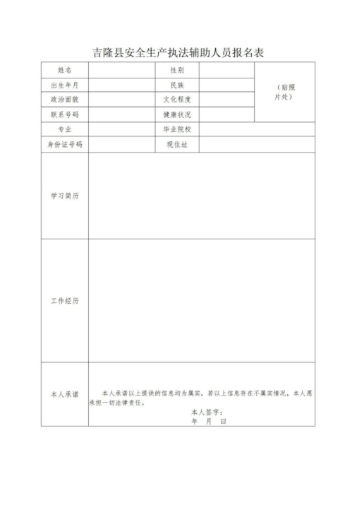 報名人員需如實填寫《吉隆縣安全生產執(zhí)法輔助報名表》(見附件1)、并應聘者攜帶身份證、畢業(yè)證或學信網學籍驗證報告、學位證原件及復印件、2寸照片一張、報名表(由吉隆縣人社局就業(yè)辦提供)各1份附件1、《吉隆縣安全生產執(zhí)法輔助報名表》