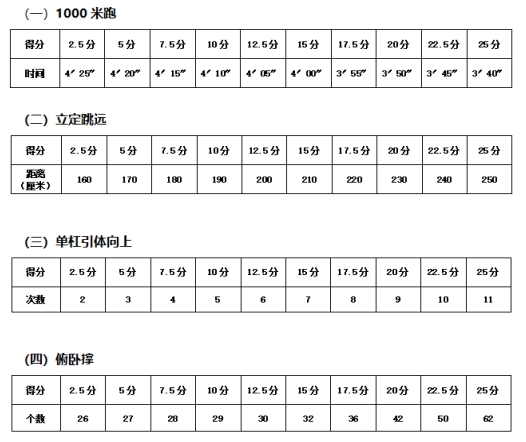 1、體能測試。體能測試項目包括1000米跑、立定跳遠、單杠引體向上、俯臥撐。具體評分標準為: