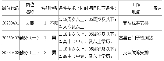 本次招聘名額共計(jì)5名,其中:文職崗位1名、勤務(wù)崗位4名,勤務(wù)崗位限男性。