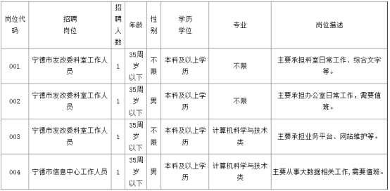 因工作需要,寧德市發(fā)展和改革委員會(huì)面向社會(huì)公開招聘勞務(wù)派遣人員4名,有關(guān)招聘專業(yè)、計(jì)劃人數(shù)及條件要求等公告如下:
