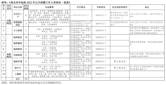 本次招聘計設(shè)32個崗位(A類崗位采用直接面試的方式,不設(shè)置開考比例。B類崗位采用筆試+面試的方式),具體崗位詳見附件《明光市中醫(yī)院2023年公開招聘工作人員崗位一覽表》(以下簡稱《崗位一覽表》)。