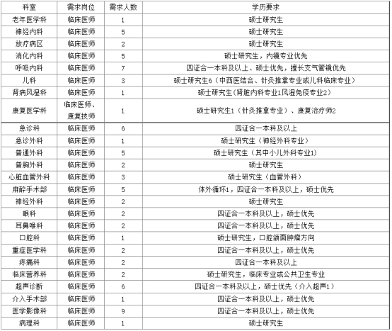 依據(jù)學(xué)科發(fā)展以及崗位需求,現(xiàn)仍需招聘以下各專業(yè)學(xué)科類臨床醫(yī)師數(shù)名(具體崗位詳情見下表)。