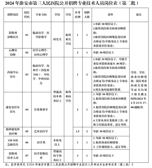 詳見(jiàn)《2024年淮安市第三人民醫(yī)院公開(kāi)招聘專(zhuān)業(yè)技術(shù)人員崗位表(第二批)》(以下簡(jiǎn)稱(chēng)《崗位表》)。
