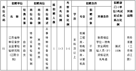 根據(jù)江蘇省特種設(shè)備安全監(jiān)督檢驗(yàn)研究院關(guān)于勞務(wù)派遣用工相關(guān)規(guī)定,現(xiàn)因事業(yè)發(fā)展需要,江蘇省特種設(shè)備安全監(jiān)督檢驗(yàn)研究院江陰分院(以下簡稱:江蘇省特檢院江陰分院)公開招聘勞務(wù)派遣用工1名,F(xiàn)將有關(guān)事項(xiàng)公布如下: