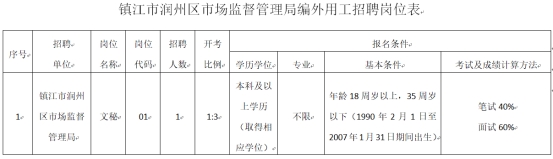 (五)招聘崗位、人數(shù)和所要求的學(xué)歷、專業(yè)等資格條件詳見《鎮(zhèn)江市潤州區(qū)市場監(jiān)督管理局編外用工招聘崗位表》(附件1)。
