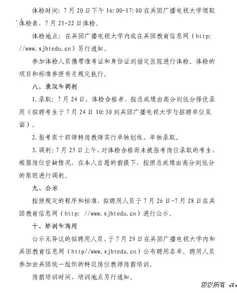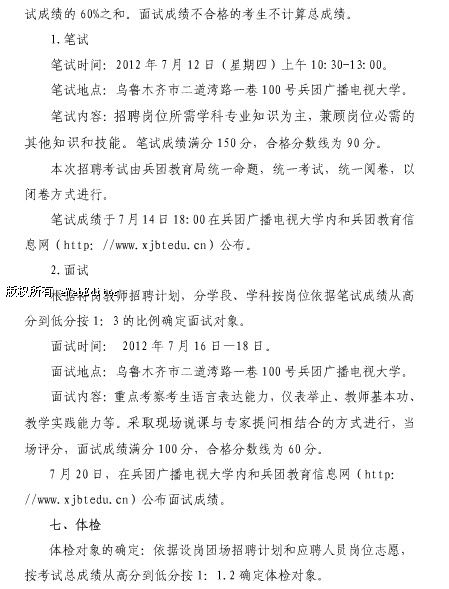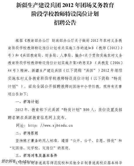 新疆生產(chǎn)建設(shè)兵團2012年團場義務(wù)教育階段學(xué)校教師特設(shè)崗位計劃招聘公告