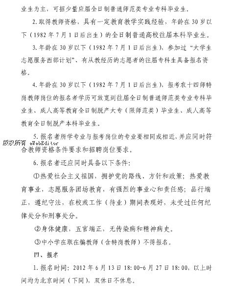 新疆兵團2012年特崗教師報名條件