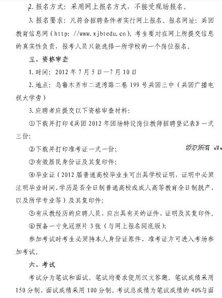 新疆建設(shè)兵團2012年特崗教師網(wǎng)上報名入口