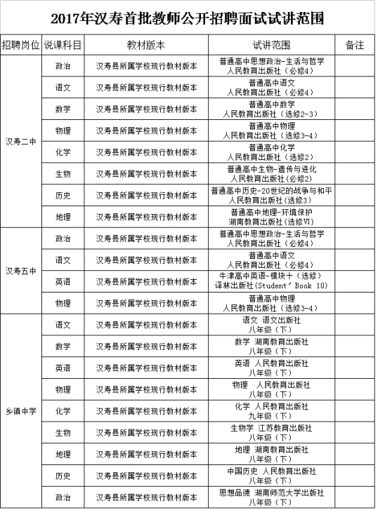 說(shuō)明: 1、面試試講時(shí)間:2017年4月28日上午8:00開(kāi)始; 2、面試試講地點(diǎn):漢壽縣詹樂(lè)貧中學(xué)(九中)附屬小學(xué); 3、備課時(shí)間為1小時(shí),備課內(nèi)容為1個(gè)課時(shí)內(nèi)容; 4、按備課內(nèi)容順序上課,時(shí)間不超過(guò)10分鐘; 5、備課占面試分30%,上課占面試分70%。