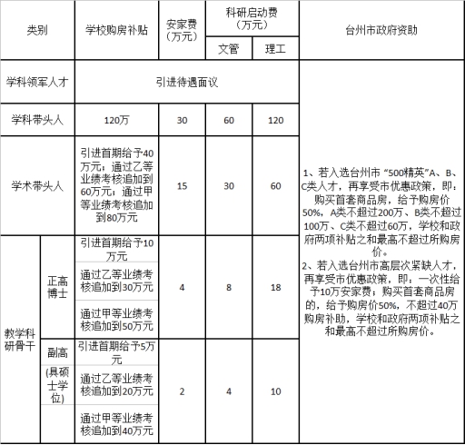 注:(1)臨床醫(yī)學(xué)院博士引進(jìn)待遇采取臺(tái)州市政府、附屬醫(yī)院和學(xué)校三方疊加的方式,其中學(xué)校給予一次性購(gòu)房補(bǔ)貼20萬(wàn)元、安家費(fèi)4萬(wàn)元和科研啟動(dòng)經(jīng)費(fèi)14萬(wàn)元;(2)國(guó)內(nèi)非在職博士后臺(tái)州市另提供10萬(wàn)元安家補(bǔ)貼和10萬(wàn)元的科研經(jīng)費(fèi);(3)全職引進(jìn)的學(xué)科領(lǐng)軍人才和學(xué)科帶頭人,以及特別優(yōu)秀的學(xué)術(shù)帶頭人可實(shí)行年薪制。學(xué)校根據(jù)引進(jìn)人才層次和承擔(dān)的職責(zé)與其協(xié)商確定年薪標(biāo)準(zhǔn)和發(fā)放方式等,簽訂年薪制聘用合同;(4)引進(jìn)人員的配偶如屬引進(jìn)對(duì)象,則全額享受學(xué)校相應(yīng)的引進(jìn)待遇,若不屬于引進(jìn)對(duì)象,具有博士學(xué)位或副高(具碩士學(xué)位),學(xué)校如安排其教學(xué)崗位,則僅給予相應(yīng)的科研啟動(dòng)費(fèi)。(5)對(duì)引進(jìn)的特別優(yōu)秀的海外高層次人才,達(dá)到高級(jí)專(zhuān)業(yè)技術(shù)職務(wù)的業(yè)績(jī)條件,可以給予相當(dāng)于副高級(jí)專(zhuān)業(yè)技術(shù)職務(wù)的年薪待遇。引進(jìn)后3年內(nèi)達(dá)到學(xué)校正高級(jí)專(zhuān)業(yè)技術(shù)職務(wù)的業(yè)績(jī)要求者,可直接申報(bào)正高級(jí)專(zhuān)業(yè)技術(shù)職務(wù),3年內(nèi)若未獲通過(guò),則取消副高級(jí)專(zhuān)業(yè)技術(shù)職務(wù)年薪待遇,并按正常評(píng)聘條件和程序申報(bào);(6)引進(jìn)的學(xué)科領(lǐng)軍人才、學(xué)科帶頭人、學(xué)術(shù)帶頭人和教學(xué)科研骨干(博士、副高)到校工作后,學(xué)校提供為期24個(gè)月的免費(fèi)周轉(zhuǎn)房。如因?qū)W校暫時(shí)不能提供周轉(zhuǎn)房,則每月分別提供學(xué)科領(lǐng)軍人才、學(xué)科帶頭人、學(xué)術(shù)帶頭人和教學(xué)科研骨干2500、2000、1500和500元的租房補(bǔ)貼。