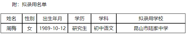 根據(jù)《2019年昆山市教育系統(tǒng)公開招聘中小學(xué)教師簡章》,周梅(人員信息附后)已通過昆山市教育局組織的筆試、面試、體檢(因懷孕緩檢)和考察,現(xiàn)進(jìn)行錄用公示,公示時(shí)間為2019年9月16日~9月24日。如對公示對象有異議,可在公示期間向昆山市教育局反映,聯(lián)系電話:57514790。