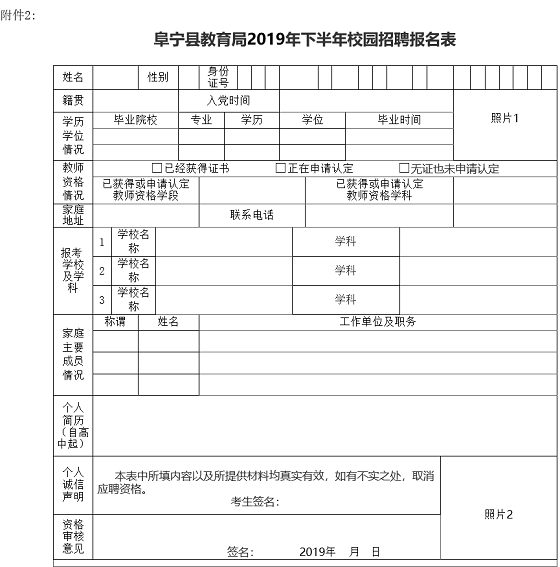 2.阜寧縣教育局2019年下半年校園招聘教師報(bào)名表