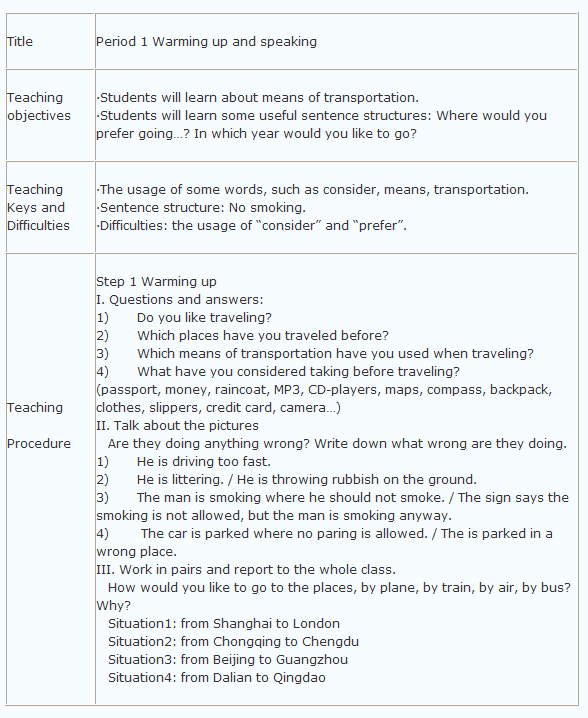 4. 引入課文上的問題:What do you have to consider before you decide which means of transportation you will use?學(xué)生七嘴八舌會答:根據(jù)路途的遠(yuǎn)近,價(jià)格,時(shí)間,速度,安全,興趣愛好,身體狀況,舒適程度等。教師總結(jié):就象剛才有同學(xué)談到,到達(dá)河姆渡可以有多種途徑,考慮時(shí)間因素,可以選擇中巴,約需一小時(shí),甚至可以打的,當(dāng)然前者經(jīng)濟(jì)。而從舒適的角度出發(fā),尤其是象我這樣會暈車的旅客,可以乘船游覽,一邊觀賞姚江兩岸風(fēng)光,還可中途上岸游玩梁祝公園,約需三個小時(shí),但一路上非常休閑、享受。學(xué)生由此明白話題可以說得豐富多彩。