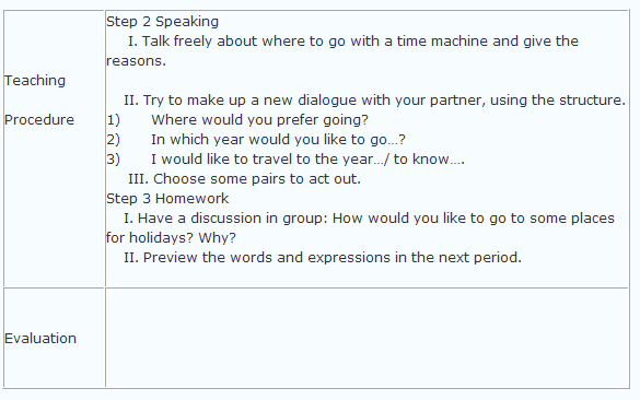 2 (圖片)過渡到文中要介紹的A Time Machine(時(shí)光機(jī)器)——人們想象中一種神奇的能夠穿越時(shí)空的交通工具,借助它,人們可以回到過去,飛向未來。讓學(xué)生簡單了解“時(shí)光機(jī)器”的性能后,我設(shè)計(jì)的一個小任務(wù)是:想象中你乘著“時(shí)光機(jī)器”來到了某地,請描述你看見的情景。有兩種形式呈現(xiàn):(一)make a similar conversation according to the dialogue in the text (二)describe a place you were,分組進(jìn)行。