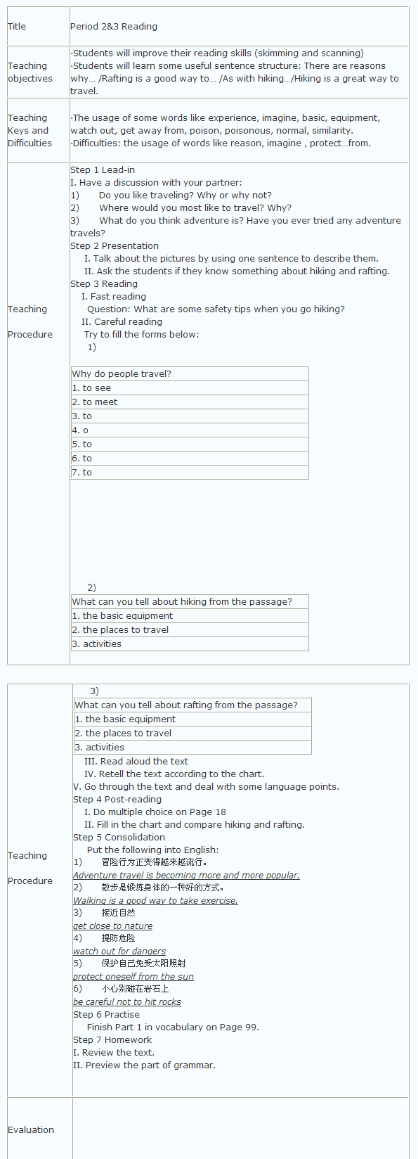 Reading 分為三部分:pre-reading, reading, post-reading. pre-reading提供了與閱讀材料相關(guān)的三個問題,啟發(fā)學(xué)生預(yù)測課文內(nèi)容;reading 是一篇關(guān)于探險(xiǎn)旅游的材料,其中介紹了hiking 與rafting,話題較新穎;post-reading設(shè)計(jì)了一些幫助學(xué)生檢測對課文作淺層、深層理解的鞏固練習(xí)。