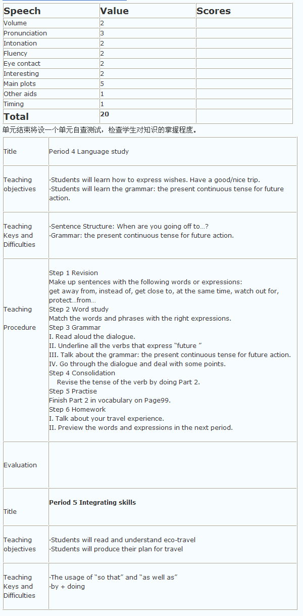 我把本單元計(jì)劃為六課時(shí),Warming-up & Listening(1課時(shí)),Speaking(1課時(shí)), Reading(一)(1課時(shí)),Reading( 二) (1課時(shí)),Grammar & Writing(1課時(shí)) ,Integrating skills (1課時(shí)),以任務(wù)為依托,分別對聽、說、讀、寫四技能進(jìn)行訓(xùn)練,各有側(cè)重,但又互相結(jié)合。注重指導(dǎo)語篇閱讀,逐步提高口頭表達(dá),筆頭寫作能力。