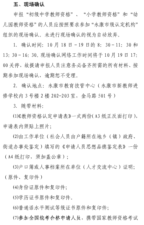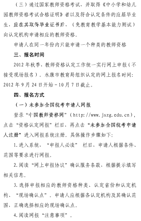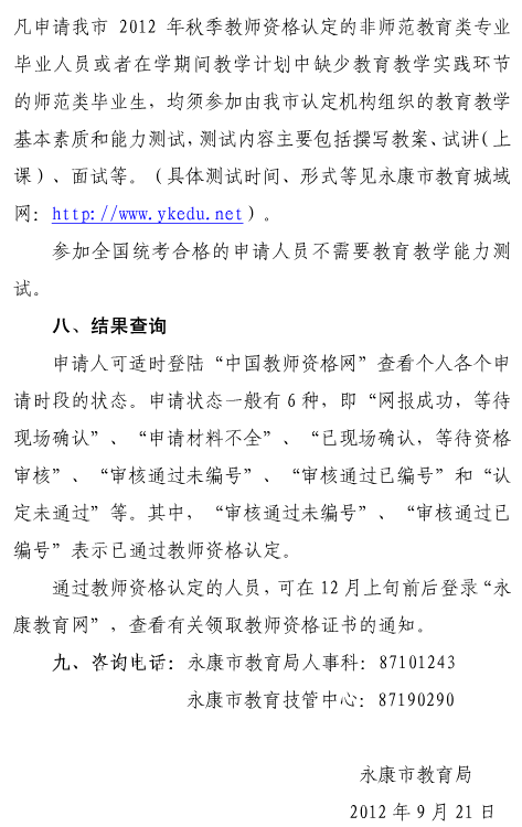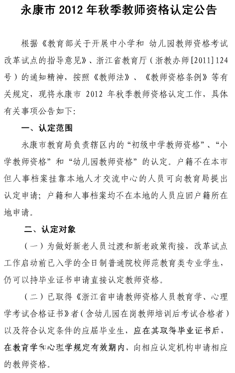浙江省金華市永康市2012年秋季教師資格認定公告