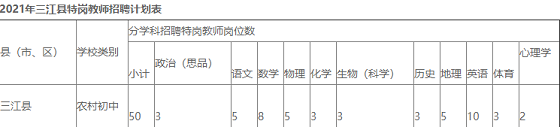 根據(jù)自治區(qū)教育廳、自治區(qū)黨委編辦、自治區(qū)財(cái)政廳和自治區(qū)人力資源和社會(huì)保障廳下發(fā)的《關(guān)于做好2021年特崗教師招聘工作的通知》(桂教特崗〔2021〕2號(hào))文件精神,柳州市三江侗族自治縣今年擬招聘農(nóng)村義務(wù)教育階段初中特崗教師50名,為做好特崗教師招聘工作,現(xiàn)將有關(guān)事項(xiàng)公告如下: