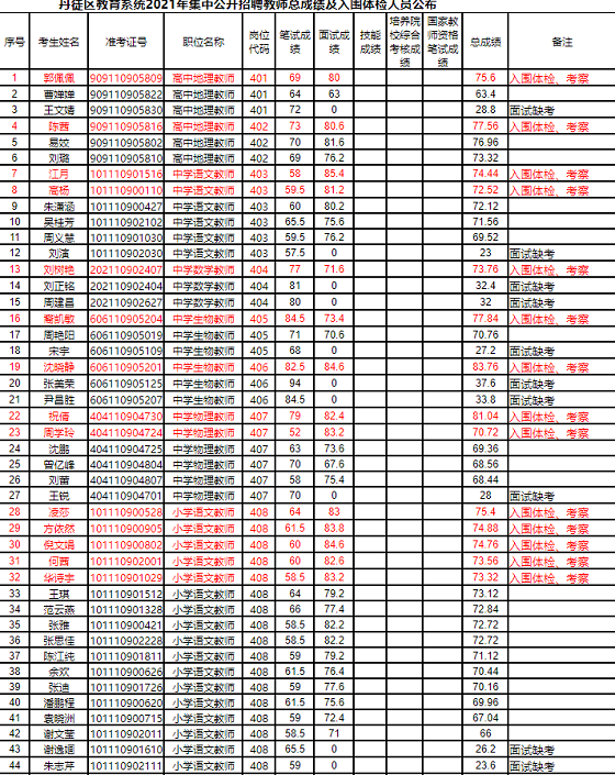 根據(jù)《丹徒區(qū)教育系統(tǒng)2021年集中公開招聘教師公告》(鎮(zhèn)徒人社事招公告[2021]2號)要求,現(xiàn)將總成績予以公布,表中紅色字體標注人員為進入體檢、考察人選。414、415、416、417、418、419崗位為鄉(xiāng)村定向師范生,因培養(yǎng)院校尚未出具綜合考核成績,總成績暫緩公布,先參加體檢、考察。入圍考生2021年6月10日(星期四)參加體檢,具體要求另行通知。