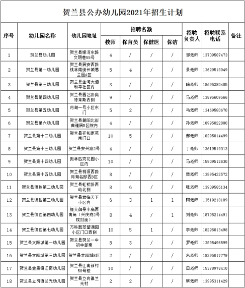 為不斷推進(jìn)賀蘭縣學(xué)前教育優(yōu)質(zhì)發(fā)展,加強(qiáng)幼兒園教師隊(duì)伍建設(shè),經(jīng)研究決定,現(xiàn)面向社會(huì)公開(kāi)招聘非在編幼兒園教師、保育員、保健醫(yī)、保潔,共計(jì)154名(其中幼兒教師116名、保育員34名、保健醫(yī)2名、保潔2名),F(xiàn)將有關(guān)事項(xiàng)公告如下: