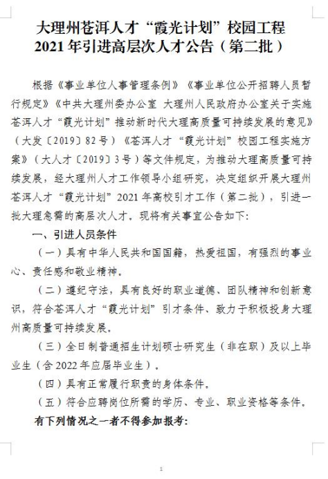 1. 大理州蒼洱人才“霞光計劃”校園工程2021年引進(jìn)高層次人才崗位表(第二批).xlsx