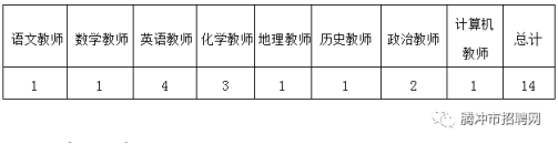 高中語文教師1名,高中數(shù)學(xué)教師1名、高中英語教師4名,高中化學(xué)教師3名,高中地理教師1名,高中歷史教師1名,高中政治教師2名,高中計算機(jī)教師1名。