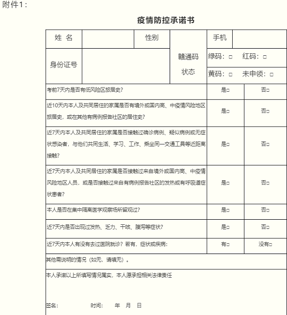 6.考試當(dāng)日,考生須提前到達(dá)考點(diǎn),憑二代居民身份證(社保卡)、紙質(zhì)面試準(zhǔn)考證、疫情防控承諾書(附件1,考生應(yīng)如實(shí)填寫,并對《疫情防控承諾書》真實(shí)性負(fù)法律責(zé)任)等材料,自覺接受身份核驗(yàn)?忌璩之(dāng)日更新的本人“贛通碼”綠碼和“通信大數(shù)據(jù)行程卡”,按本公告疫情防控要求第4點(diǎn)、第5點(diǎn)要求提供核酸檢測陰性證明。掃“場所碼”、接受體溫檢測(不超過37.3℃),通過檢測通道時(shí),應(yīng)保持人員間隔大于1米,服從現(xiàn)場工作人員管理及防疫安排。