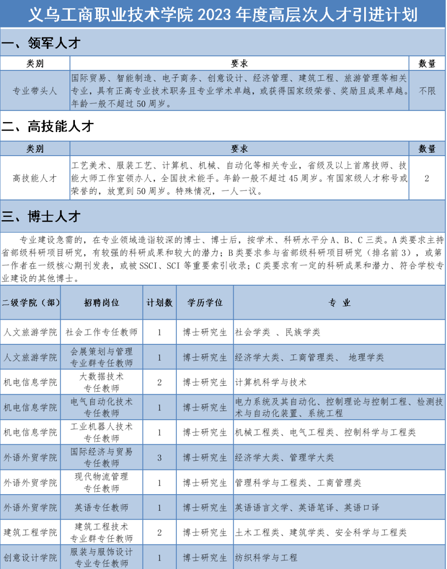 義烏工商職業(yè)技術(shù)學(xué)院是浙江省高職高水平學(xué)校、浙江省優(yōu)質(zhì)高職院校,榮登全國創(chuàng)新創(chuàng)業(yè)典型經(jīng)驗高校,獲評國家級創(chuàng)新創(chuàng)業(yè)教育實踐基地。現(xiàn)因?qū)W校發(fā)展需要,面向社會招聘一批高層次人才和專任教師。