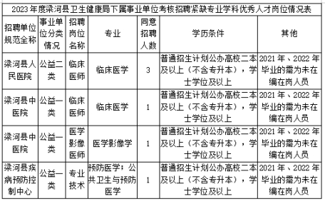3.部分崗位學(xué)歷條件有變化的,以《梁河縣2023年考核招聘衛(wèi)生健康部門緊缺專業(yè)學(xué)科優(yōu)秀人才崗位計(jì)劃表》所列為準(zhǔn)。