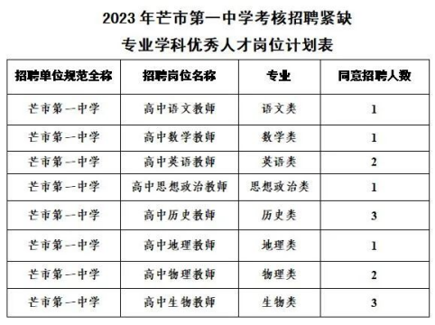 根據(jù)《德宏州人力資源和社會保障局關(guān)于印發(fā)2023年教育衛(wèi)生部門考核招聘緊缺專業(yè)學(xué)科優(yōu)秀人才工作方案的通知》(德人社發(fā)〔2023〕5號)、《中共德宏州委機(jī)構(gòu)編制委員會辦公室關(guān)于同意2023年度芒市部分事業(yè)選優(yōu)的批復(fù)》(2023-18)文件精神,芒市第一中學(xué)擬面向社會公開考核招聘緊缺專業(yè)學(xué)科優(yōu)秀人才14名,現(xiàn)將相關(guān)事宜公告如下: