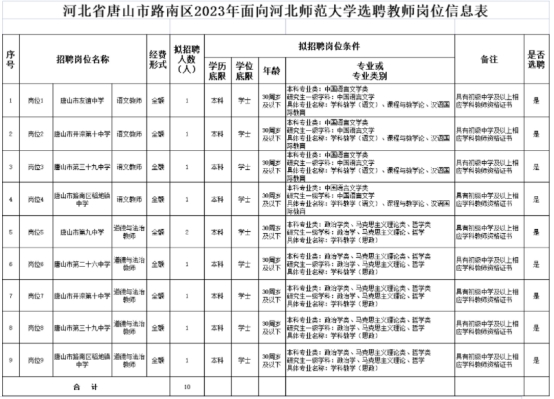 本次選聘事業(yè)單位編制教師共10名,語(yǔ)文教師4名、道德與法治教師6名。具體選聘人數(shù)和崗位條件詳見《河北省唐山市路南區(qū)2023年面向河北師范大學(xué)選聘教師崗位信息表》。