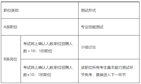 2.基本能力測(cè)試主要采取專業(yè)技能測(cè)試、小組討論等形式,對(duì)考生進(jìn)行考察。各職位具體考核形式見下表。
