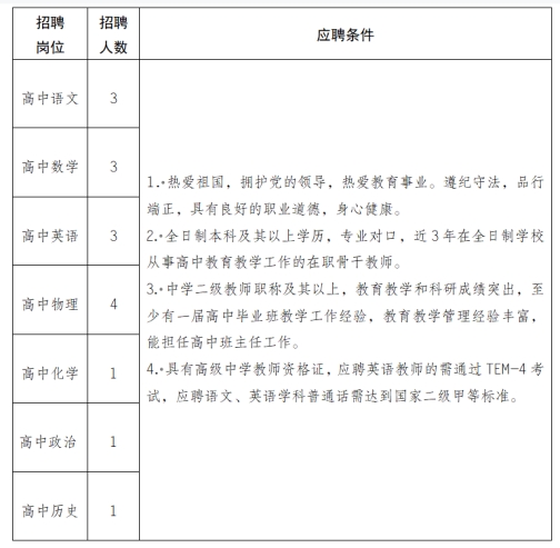 注:男教師年齡在40歲以下,女教師年齡在35歲以下。滿足以下條件之一并取得相關證件者,年齡可適當放寬,同等條件下予以優(yōu)先考慮。