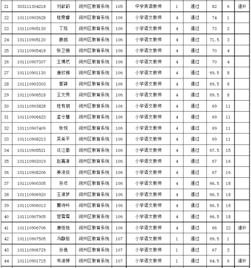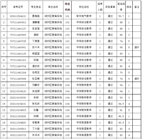 根據(jù)《2023年鎮(zhèn)江市潤州區(qū)教育系統(tǒng)公開招聘教師公告》(鎮(zhèn)潤人社事招公告〔2023〕2號)要求,以下考生通過了資格復(fù)審,現(xiàn)予以公示。請考生在鎮(zhèn)江市人事考試考工服務(wù)平臺“事業(yè)單位考試專欄”查詢閱讀《2023年揚中市、句容市、京口區(qū)、潤州區(qū)、丹徒區(qū)、鎮(zhèn)江新區(qū)公開招聘教師和校醫(yī)集中面試通告》,查看本人報考職位面試日期安排和面試通知單打印開始時間。咨詢電話:0511-85589160。
