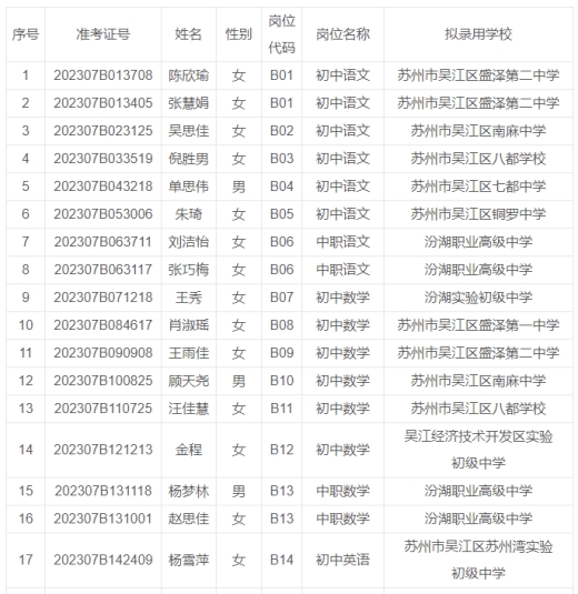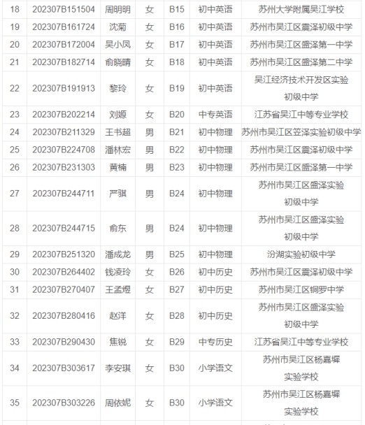 根據(jù)《2023年蘇州市吳江區(qū)第二次公開招聘備案制教師公告》,經(jīng)過考試、體檢、政審等程序,以下擬錄用人員予以公示。