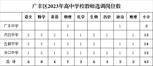 為保證我區(qū)高中學(xué)校正常教育教學(xué)工作需要,經(jīng)廣豐區(qū)高中學(xué)校教師選調(diào)工作領(lǐng)導(dǎo)小組研究同意,決定在民辦學(xué)校待返崗及歷年來(lái)已從民辦學(xué)校返回至區(qū)內(nèi)公辦義務(wù)教育階段學(xué)校任教的教師中,選調(diào)部分教師到我區(qū)高中學(xué)校任教,具體如下: