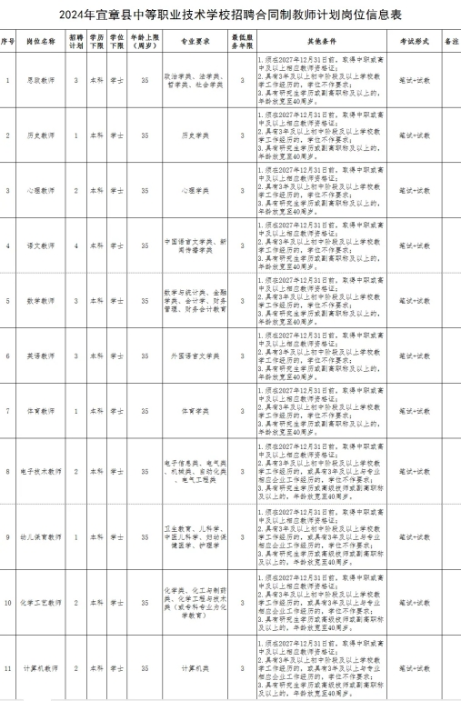 1.計(jì)劃招聘合同制教師24名,具體招聘崗位、計(jì)劃數(shù)及資格條件等詳見《2024年宜章縣中等職業(yè)技術(shù)學(xué)校招聘合同制教師計(jì)劃崗位信息表》(附件1,以下簡稱《崗位信息表》)。