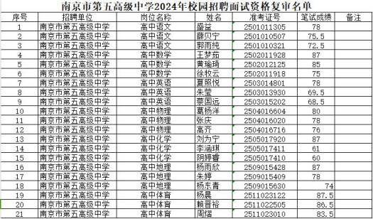 根據(jù)《江蘇省事業(yè)單位公開招聘人員辦法》(蘇辦發(fā)[2020]9號)、關(guān)于印發(fā)《江蘇省事業(yè)單位公開招聘人員面試暫行辦法》的通知(蘇人社發(fā)[2013]325號),依據(jù)2024年10月28日發(fā)布的《南京市教育系統(tǒng)部分事業(yè)單位2024年10月公開招聘教師公告》的公告(寧事招公告(R)〔2024〕36號),現(xiàn)將進入資格復(fù)審人員名單公告如下。