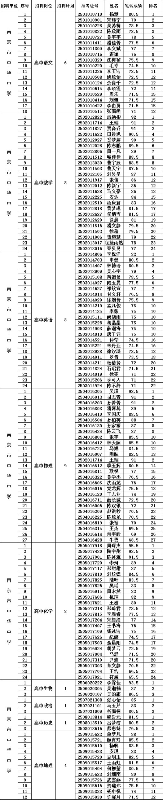 南京市中華中學2024年10月公開招聘教師資格復審考生名單