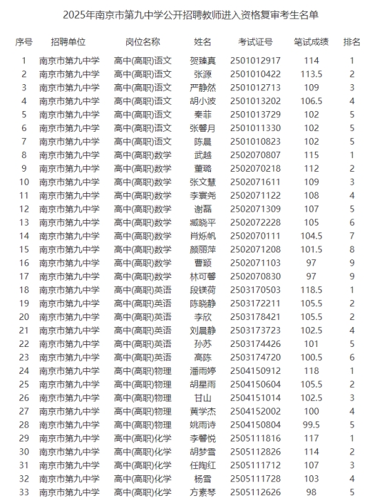 《2025年南京市第九中學(xué)公開招聘教師進(jìn)入資格復(fù)審考生名單》(附后)