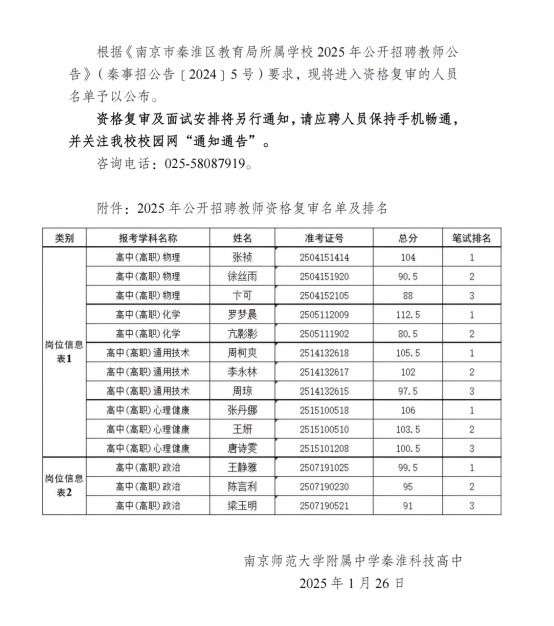 2025年南京師范大學(xué)附屬中學(xué)秦淮科技高中公開招聘教師資格復(fù)審名單公示