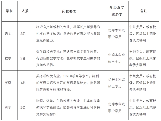 基于學(xué)校發(fā)展需要,2025年計(jì)劃公開(kāi)招聘初中教師如下: