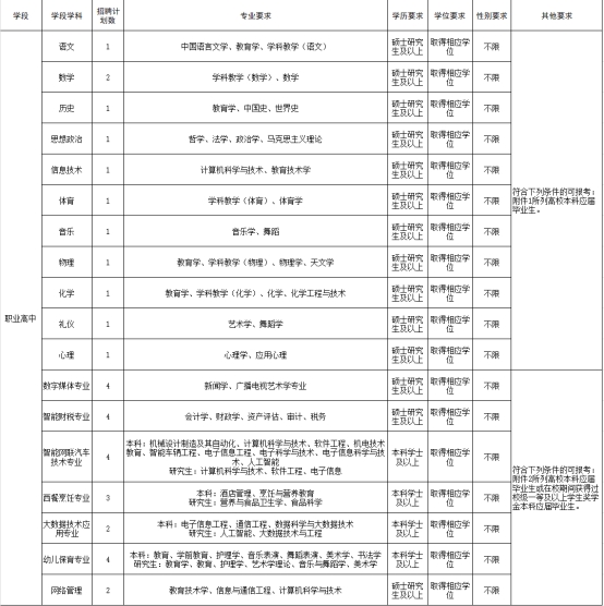 5.符合崗位要求的學歷、學位、專業(yè)等要求。要求為碩士研究生及以上學歷和學位;符合下列條件的可報考,部屬和省部共建師范院校本科應屆畢業(yè)生可報考職業(yè)高中文化課教師,雙一流高校本科應屆畢業(yè)生或在校期間獲得過校級一等及以上學生獎學金本科應屆畢業(yè)生可報考專業(yè)課教師。專業(yè)審查認定參考教育部《研究生教育學科專業(yè)目錄》(2022年)和《普通高等學校本科專業(yè)目錄》(2024年)。目錄中未列入的專業(yè)或各高校新設專業(yè),以及國(境)外高校專業(yè),如與崗位要求的專業(yè)相近、相似的,由報考人員提供相應的學習課程及培養(yǎng)目標等佐證資料,證明確實相近、相似的,本著“宜寬不宜窄、有利于人才選拔”的原則進行審查認定。具有研究生學歷的考生,大學本科或研究生階段所學專業(yè)符合選聘崗位要求的,均視為符合專業(yè)要求;