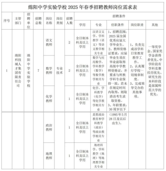 詳見附件《綿陽中學(xué)實驗學(xué)校2025年春季招聘教師崗位需求表》。