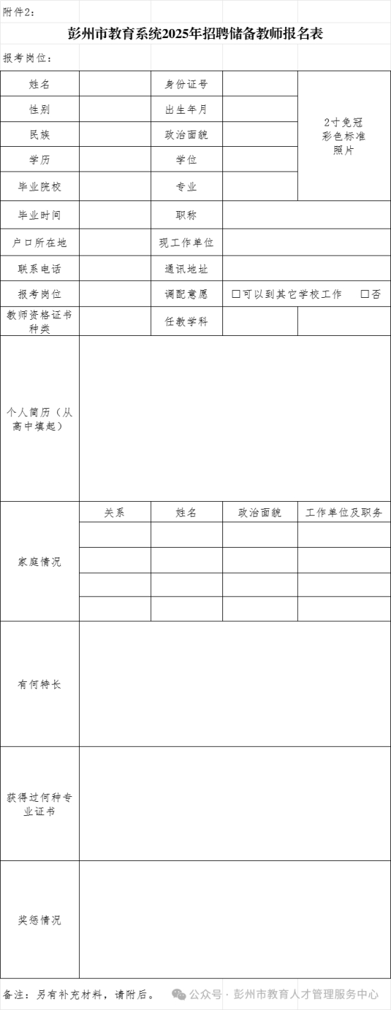 網(wǎng)絡(luò)報名方式:關(guān)注“彭州市教育人才管理服務(wù)中心”微信公眾號。截止7月27日16:00前,在教師招聘欄目-招聘報名欄目,選擇“人才中心儲備教師”項目填寫相關(guān)報名信息并上傳本人電子標(biāo)準(zhǔn)照、身份證、畢業(yè)證書、學(xué)位證書、教師資格證書、普通話等級證書、英語等級證書及相關(guān)獲獎證書照片等信息,經(jīng)審核合格后,按通知繳費(fèi)打印《業(yè)務(wù)考核通知書》參加業(yè)務(wù)考核。