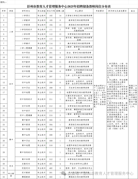 結(jié)合彭州市教育系統(tǒng)下屬中小學(xué)校的實際需求,按照公開、平等、競爭、擇優(yōu)的原則,彭州市教育人才管理服務(wù)中心受彭州市教育局委托,現(xiàn)面向社會公開招聘152名儲備教師,具體事項公告如下: