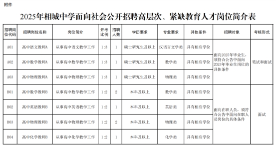 招聘崗位及條件等詳見《2025年相城中學面向社會公開招聘高層次、緊缺教育人才崗位簡介表》(附件,以下簡稱“崗位簡介表”)。可在蘇州市人力資源和社會保障局官網(wǎng)(http://hrss.suzhou.gov.cn)、相城區(qū)教育信息網(wǎng)(http://www.xcjyxx.com/)、相城人才網(wǎng)(https://www.szxchr.com/)上查詢。